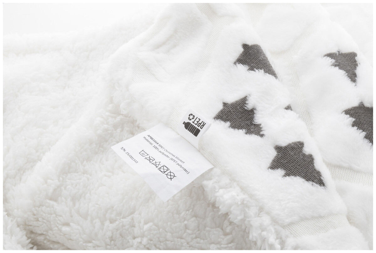 Luxusní dvouvrstvá vánoční deka z RPET s reliéfním zimním vzorem. S flanelovým fleecovým materiálem RPET 270 g/m2 a oboustrannou podšívkou z RPET sherpa fleecu 210 g/m2. Zabaleno do stuhy a tisknutelného papírového kartonu.
