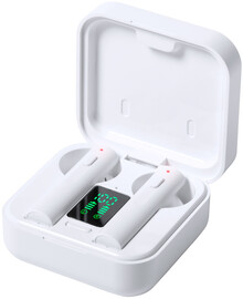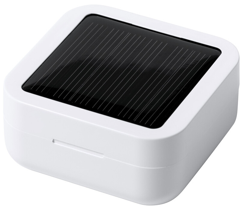 Skutečná bezdrátová stereofonní sluchátka (TWS) s funkcí hands-free volání v plastovém nabíjecím pouzdře se solární nabíječkou. Včetně nabíjecího kabelu USB.