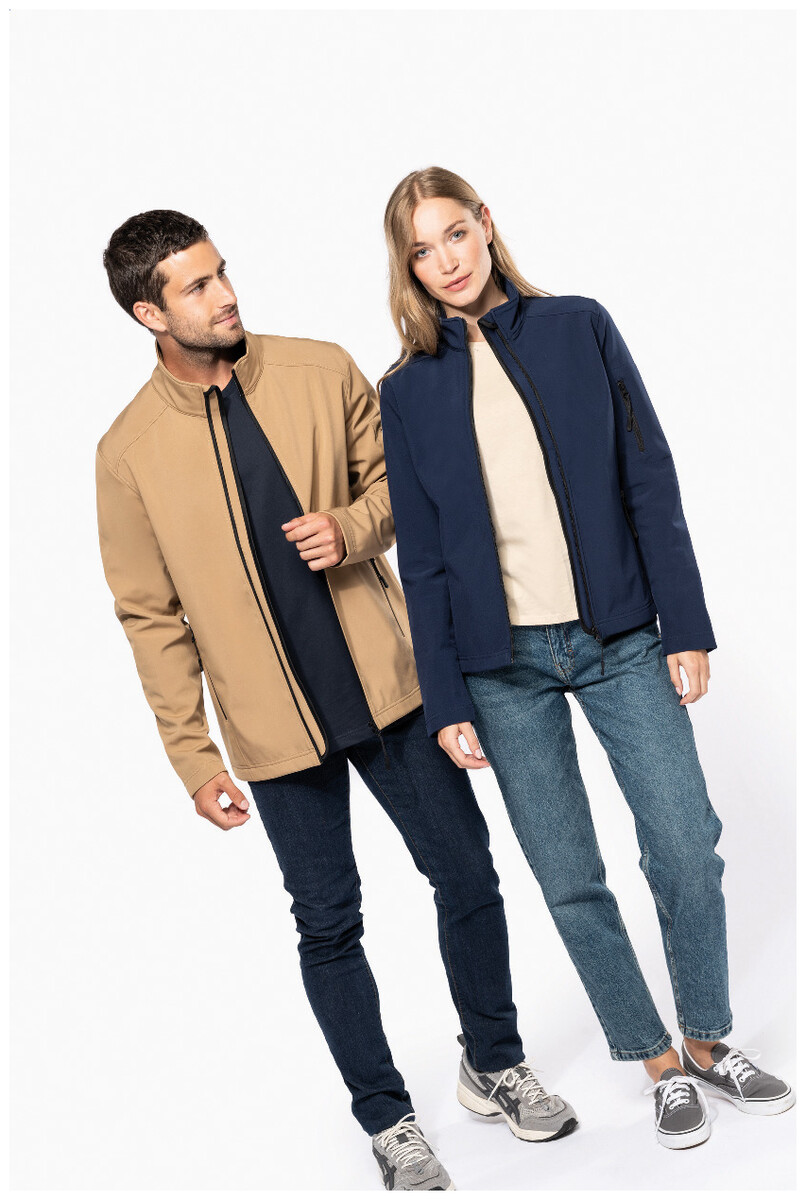 Třívrstvá, prodyšná, větru a vodě odolná softshellová bunda na zip s rukávy na zip a bočními kapsami. S prodyšnou střední vrstvou a vnitřní vrstvou z mikropolaru. Materiál: 95 % polyester a 5 % elastan, 300 g/m2. Výrobek značky Kariban.