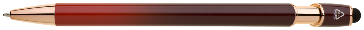 Elegantní kuličkové pero s kovovým tělem v moderním červeno-oranžovém přechodu a detaily z růžového zlata. Na konci má dotykovou část pro ovládání mobilu či tabletu. Výsledný efekt laserového značení je světle stříbrný až bílý. Náplň X-20 modře píšící.