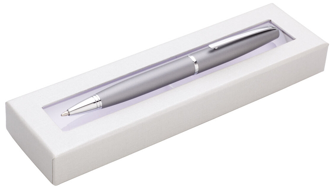 kovová propiska v dárkové krabičce s průhledným okénkem.