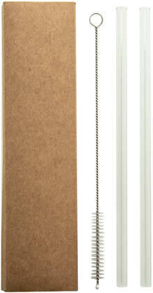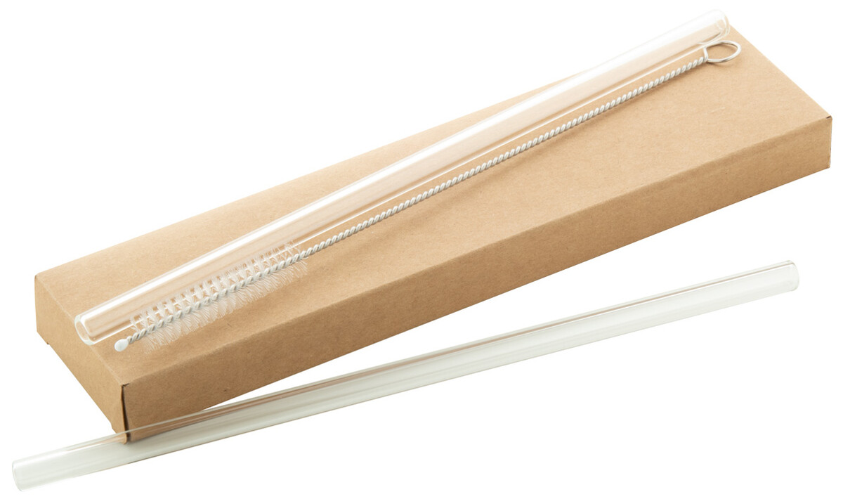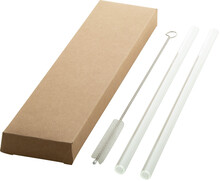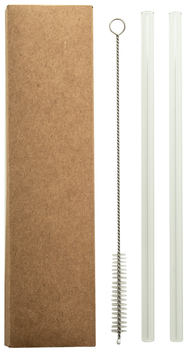 Sada 2 opakovaně použitelných brček na pití z borosilikátového skla a čisticího kartáčku. V papírové krabičce ze sulfátu.