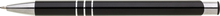 TRIALI hliníková reklamní tužka. Lesklé černé tělo se třemi stříbrnými proužky a chromovými doplňky.Velkoobsahová modrá náplň.