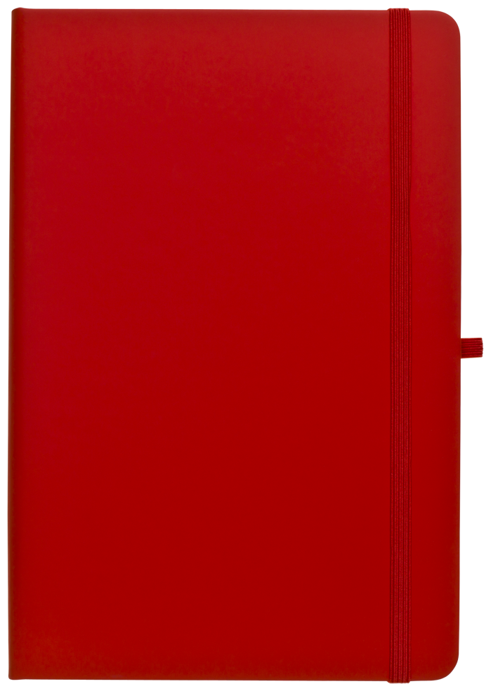 Zápisník A5 v červených deskách z PU materiálu má 80 linkovaných listů. Blok má uzavírací gumičku, poutko na propisku a textilní záložku v barvě desek.