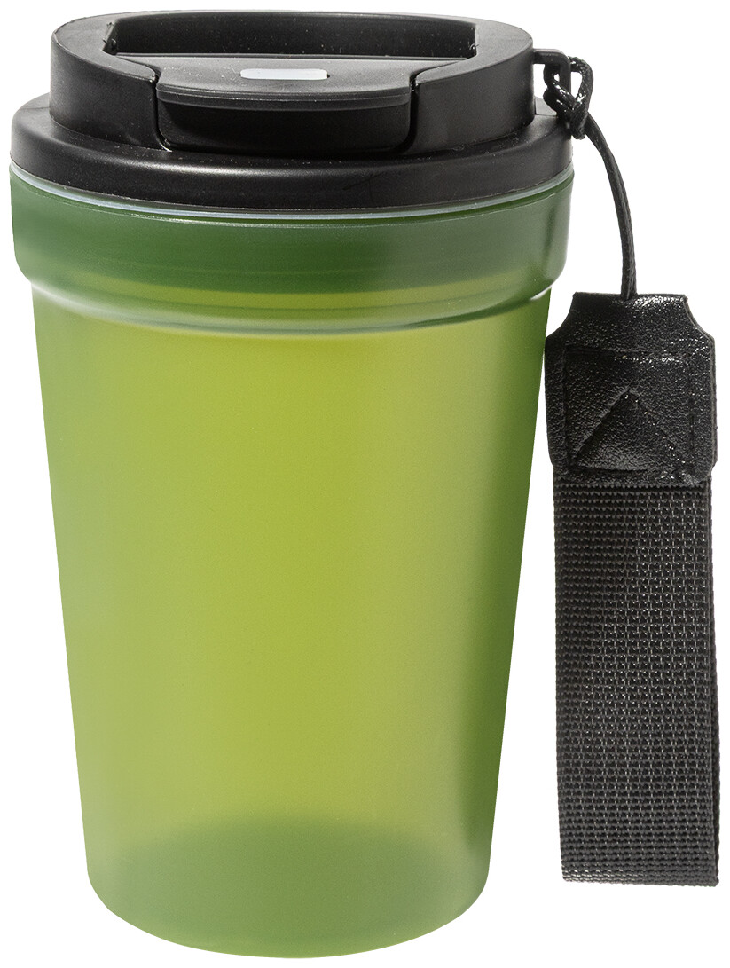 Jednostěnný cestovní kelímek z PP plastu s matnou povrchovou úpravou, víčkem na pití a poutkem z RPET polyesteru. 400 ml.