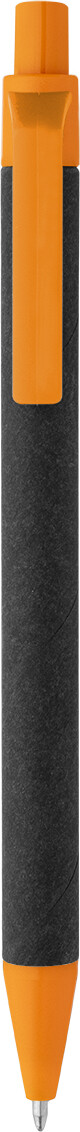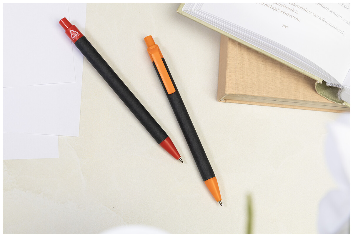 Kuličkové pero z recyklovaného papíru s černým tělem a recyklovanými ABS díly. S modrou náplní.