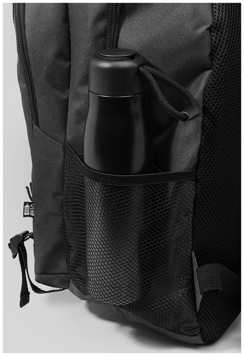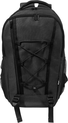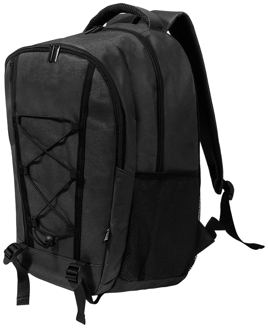 Outdoorový batoh z RPET s přihrádkami na zip a přední kapsou, polstrovanou přihrádkou na notebook (15"), síťovanými bočními kapsami a elastickými šňůrkami vpředu. S polstrovanými zády a ramenními popruhy. Polyester 600D RPET s výrazným štítkem RPET.