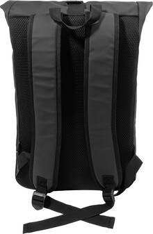 Voděodolný batoh s rolovacím vrškem z měkké recyklované PU kůže s hlavní přihrádkou na zip a zapínáním na přezku, přední kapsou s voděodolným zipem, polstrovanou přihrádkou na notebook (15") a reflexním proužkem. S polstrovanými zády a ramenními popruhy. S výraznou nálepkou z recyklované PU kůže.