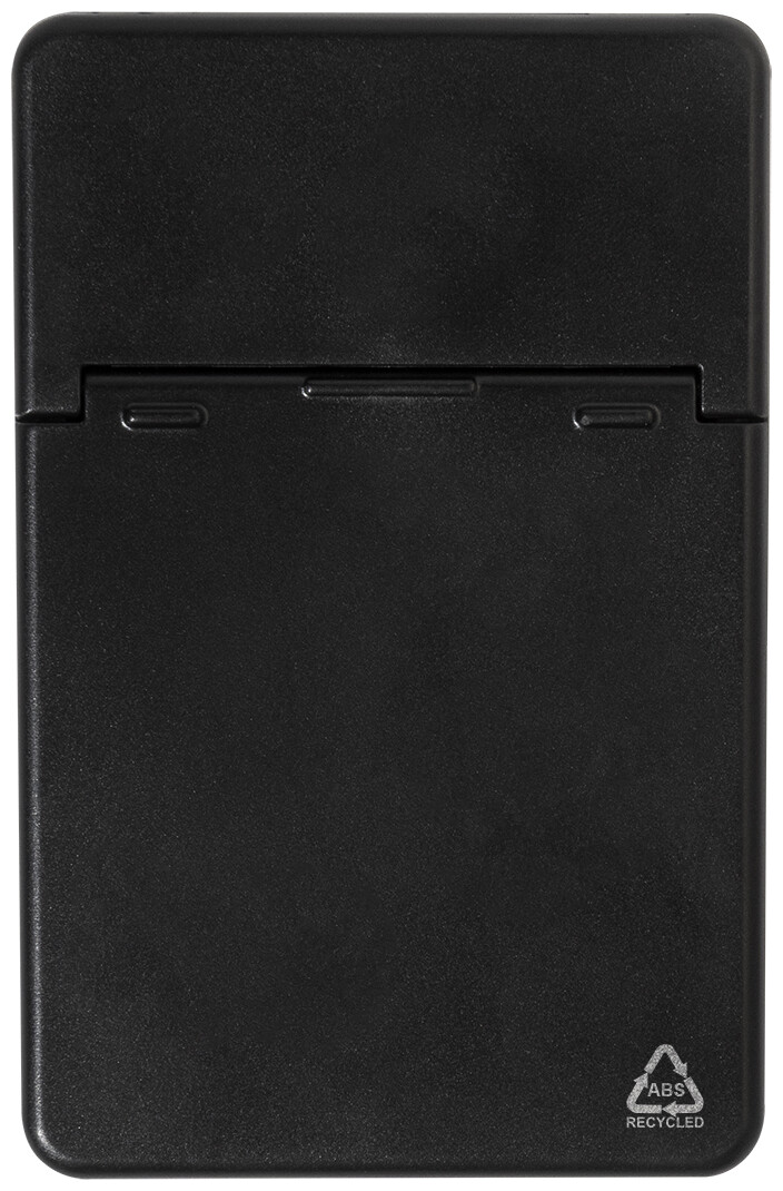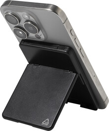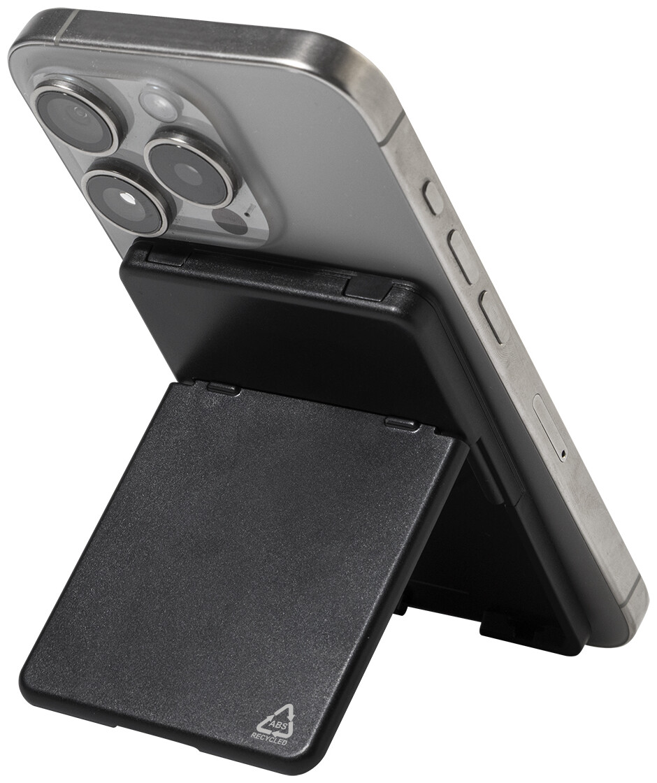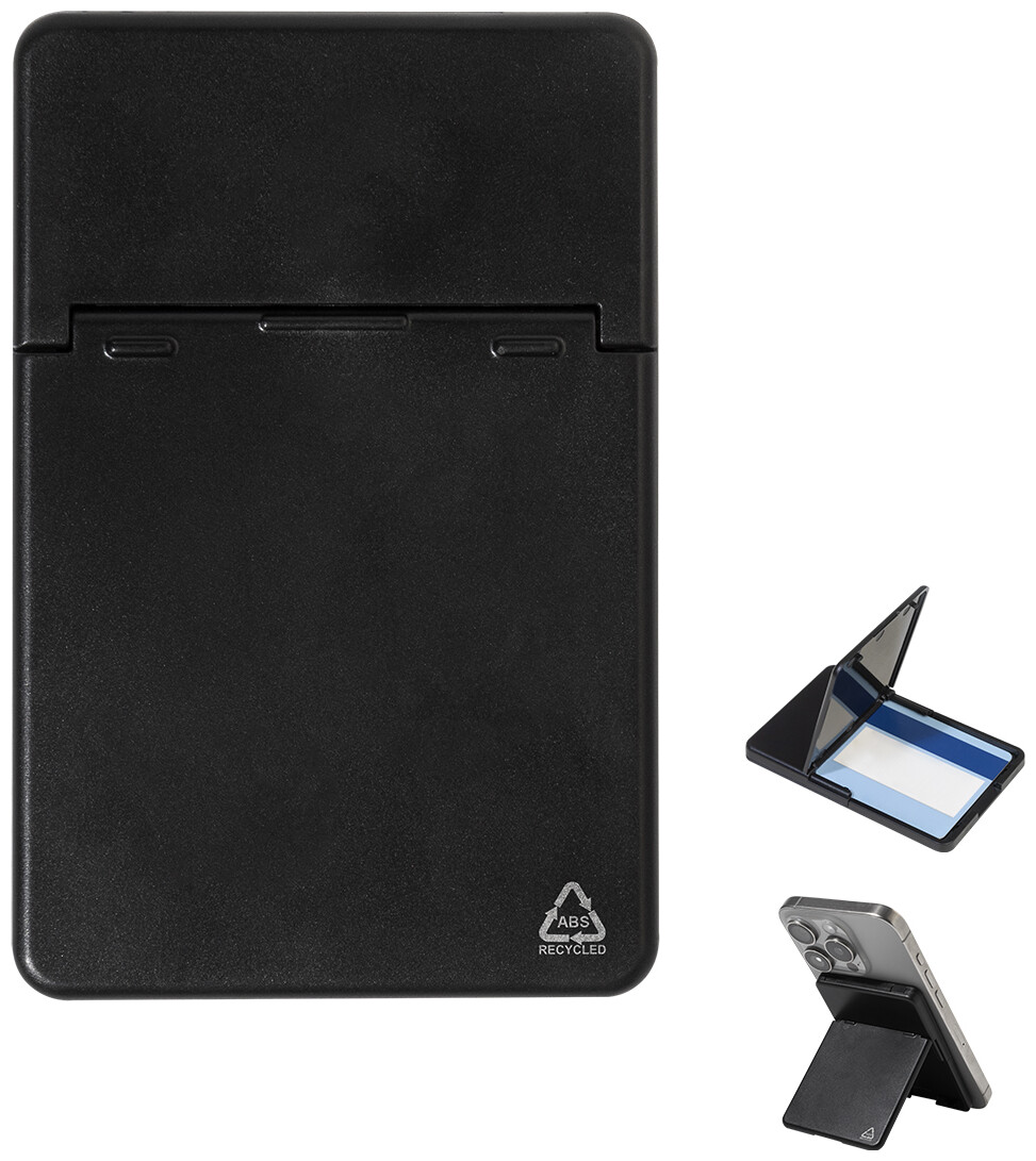 Pouzdro na kreditní karty z recyklovaného ABS s blokováním RFID, funkcí držáku na mobil a magnetickým uchycením telefonu. Včetně samolepicího kovového kroužku pro telefony bez magnetického povrchu.