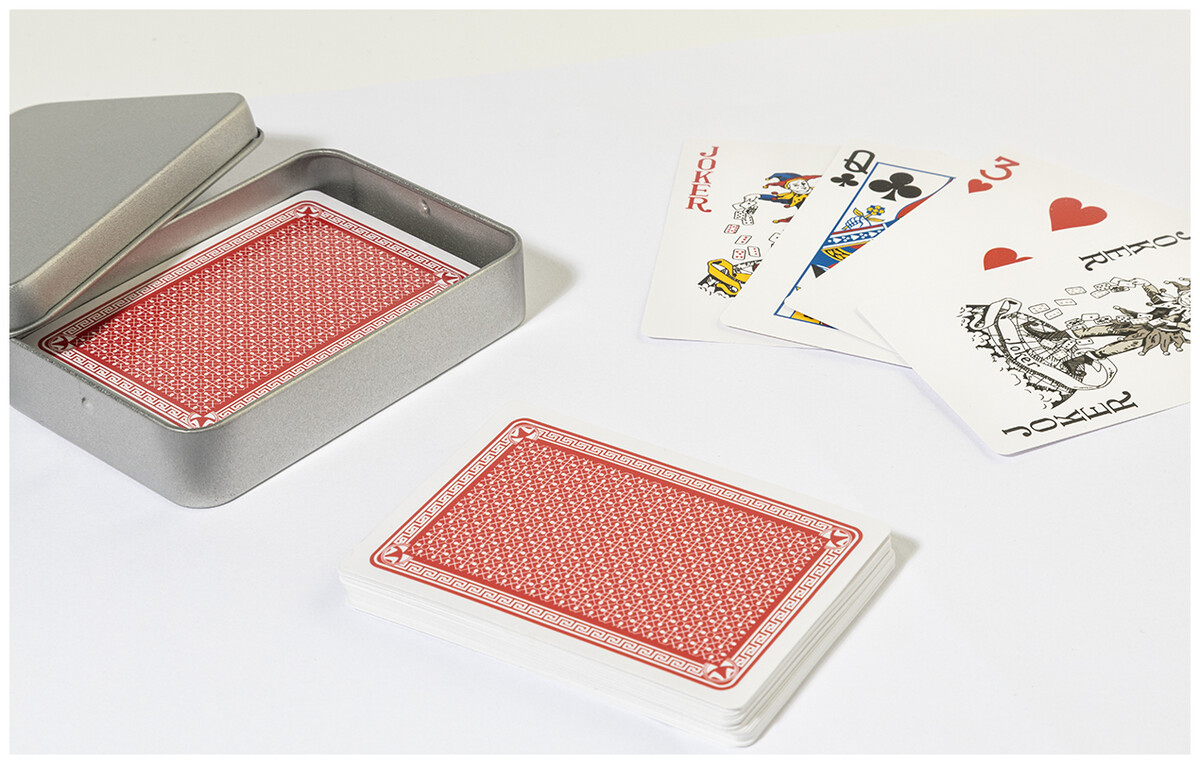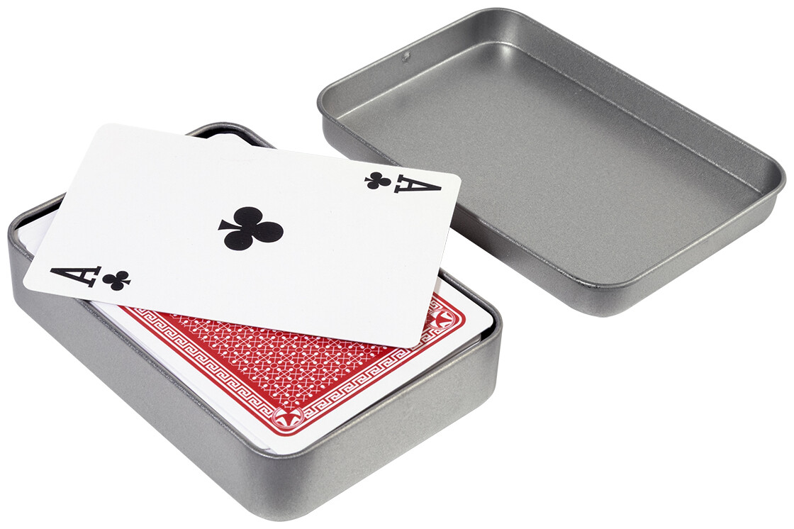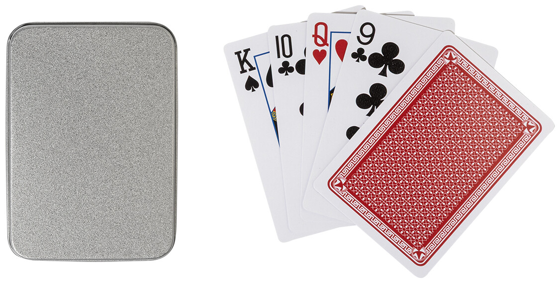 Klasické hrací karty z recyklovaného papíru ve stříbrné plechové krabičce. Jeden standardní balíček s 54 kartami.