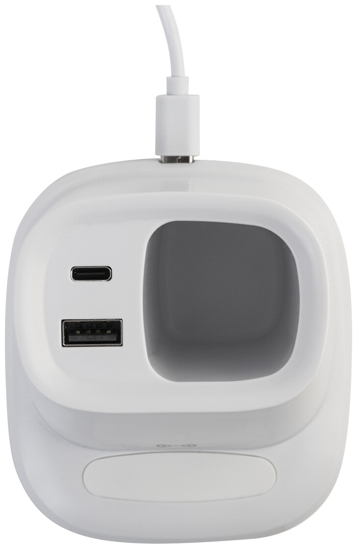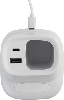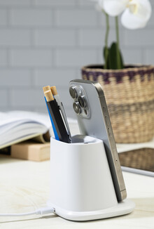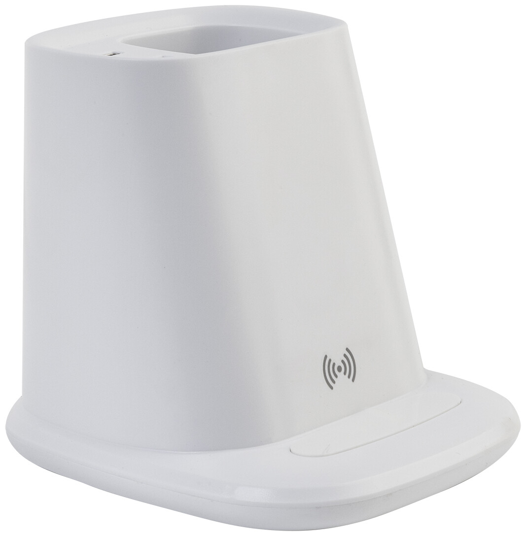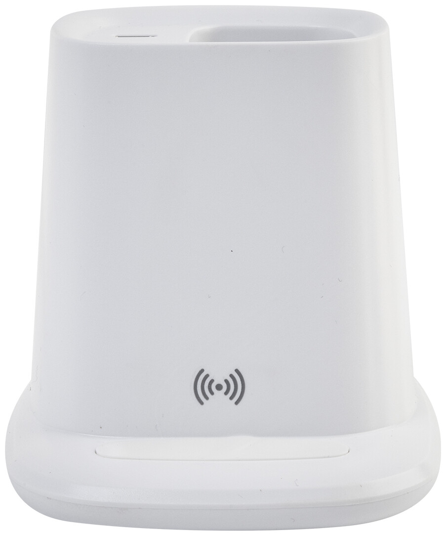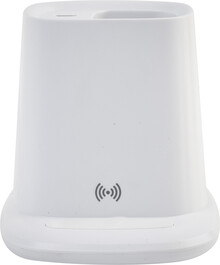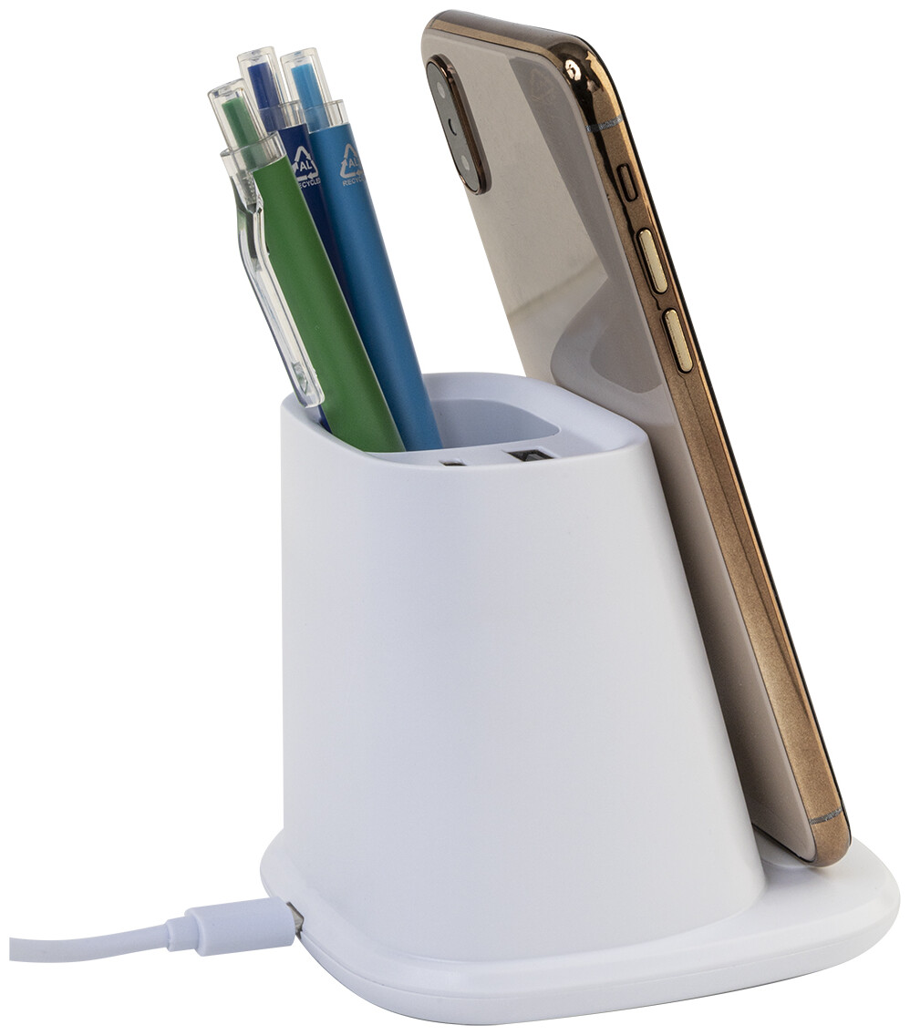 Multifunkční stojánek na pero z recyklovaného ABS plastu s držákem na mobil, vestavěnou bezdrátovou rychlonabíječkou (10 W), 1 USB a 1 USB-C portem pro nabíjení. Včetně USB kabelu pro nabíjení.