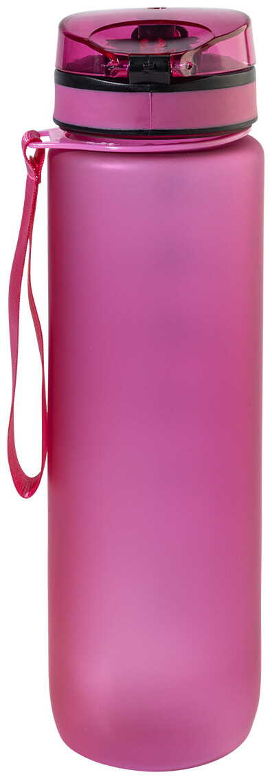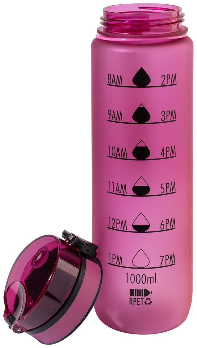 Sportovní láhev z matného RPET s motivačním objemovým a časovým značením, s automaticky otevíratelným odklápěcím víčkem s bezpečnostním zámkem a poutkem na nošení. 1000 ml. Bez BPA. Nevhodné pro sycené nápoje.
