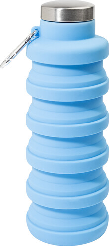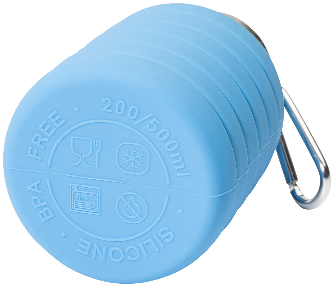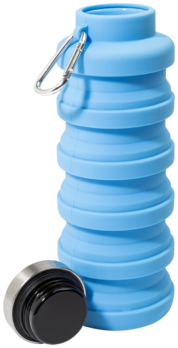 Skládací silikonová láhev s víčkem z nerezové oceli a hliníkovou karabinou. 500 ml