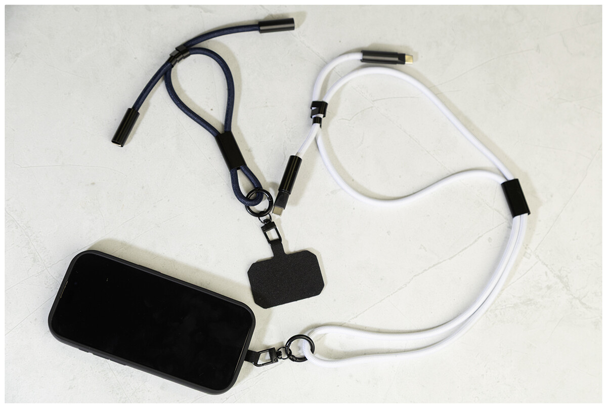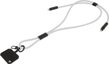 Šňůrka s držákem na mobil z RPET s vložkou pro telefon, karabinou a integrovaným nabíjecím kabelem USB-C na USB-C se skrytými konektory. Podporuje rychlé nabíjení a přenos dat PD 60W.