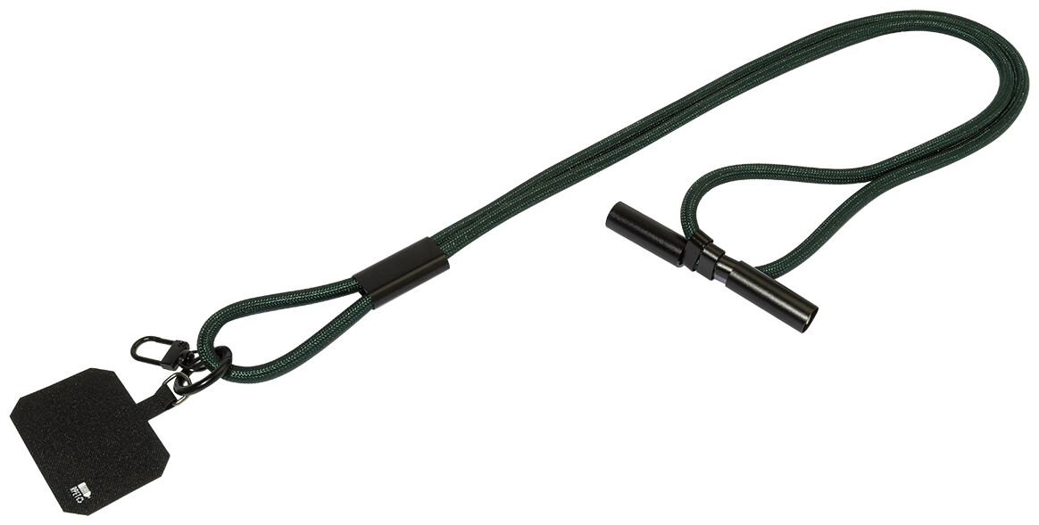 Šňůrka s držákem na mobil z RPET s vložkou pro telefon, karabinou a integrovaným nabíjecím kabelem USB-C na USB-C se skrytými konektory. Podporuje rychlé nabíjení a přenos dat PD 60W.