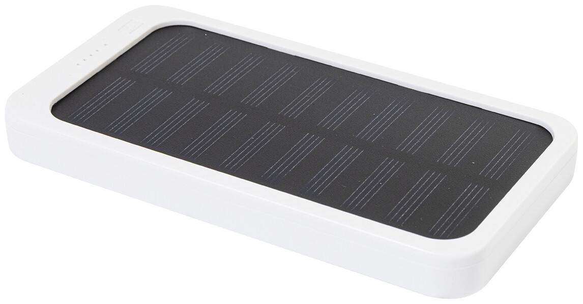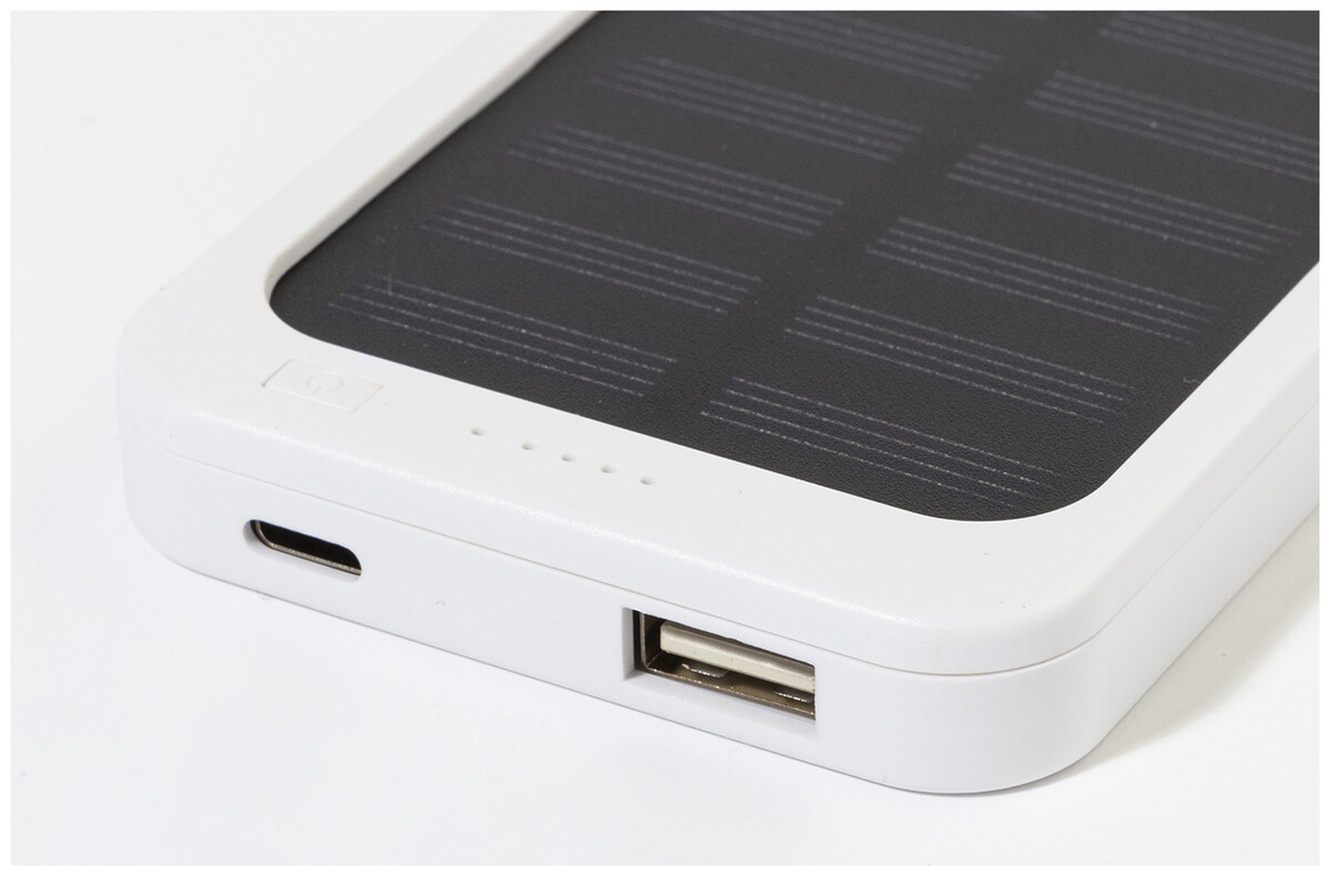Power banka z recyklovaného ABS plastu s vestavěnou solární nabíječkou a baterií 4000 mAh. S 1 USB a 1 USB-C portem pro nabíjení. Vstupní port USB-C. Včetně nabíjecího kabelu USB.