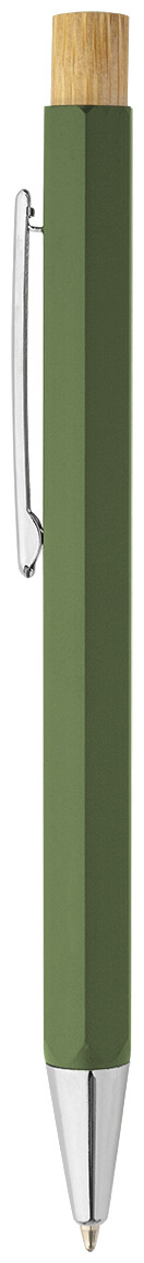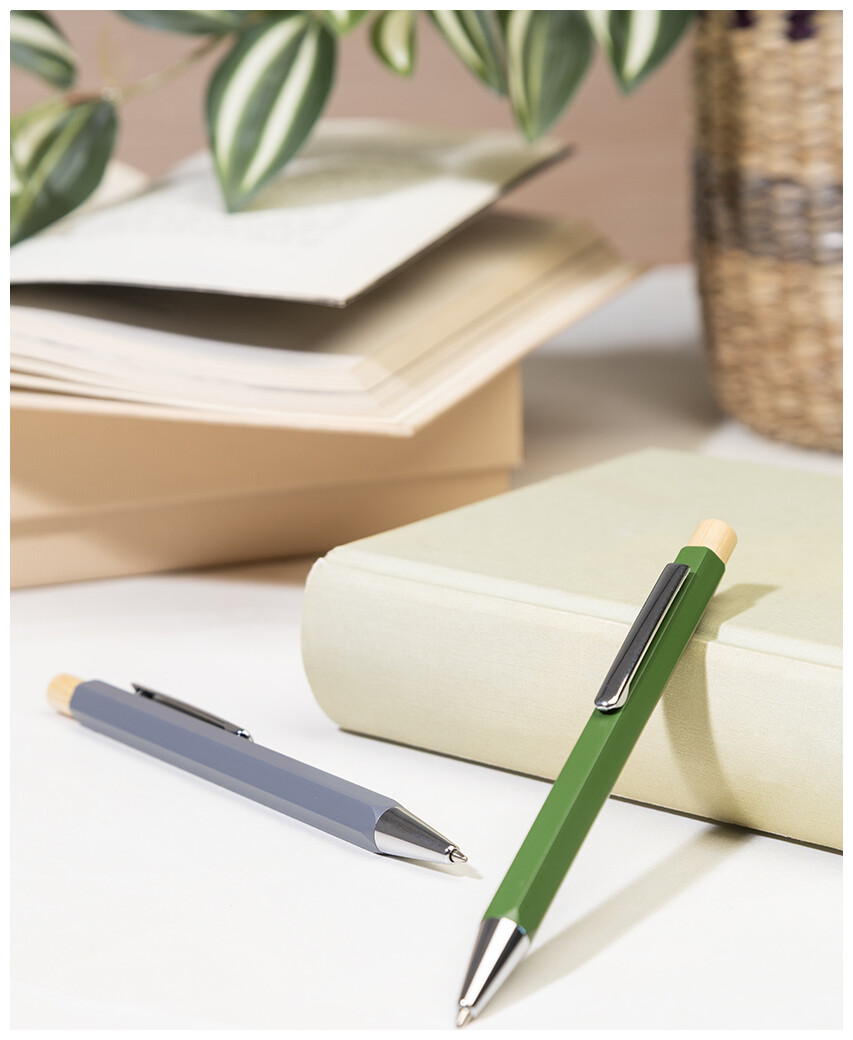 Šestihranné kuličkové pero z recyklovaného hliníku s bambusovým tlačítkem a chromovanými částmi. S modrou náplní.