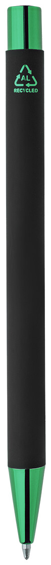 Kuličkové pero z recyklovaného hliníku s černým pogumovaným tělem a barevnými lesklými kovovými částmi. Se speciálním povrchem pro zrcadlové gravírování, které ladí s kovovými částmi. S modrou náplní.