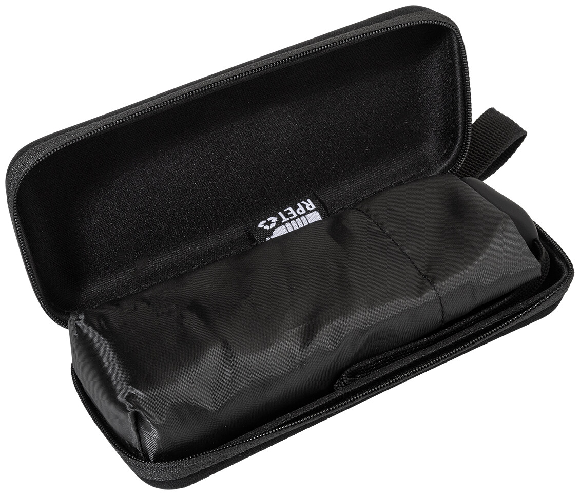 Manuální, větruodolný 3-skládací mini deštník se 6 panely v barevně sladěném pouzdře a tvrdým pouzdrem z EVA na zip. S kovovým rámem, žebry z sklolaminátu a kompaktní rukojetí s poutkem na ruku. 190T RPET pongee s charakteristickým RPET štítkem.