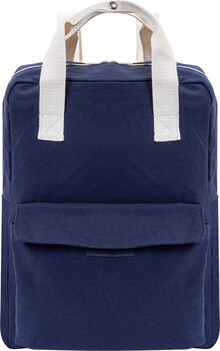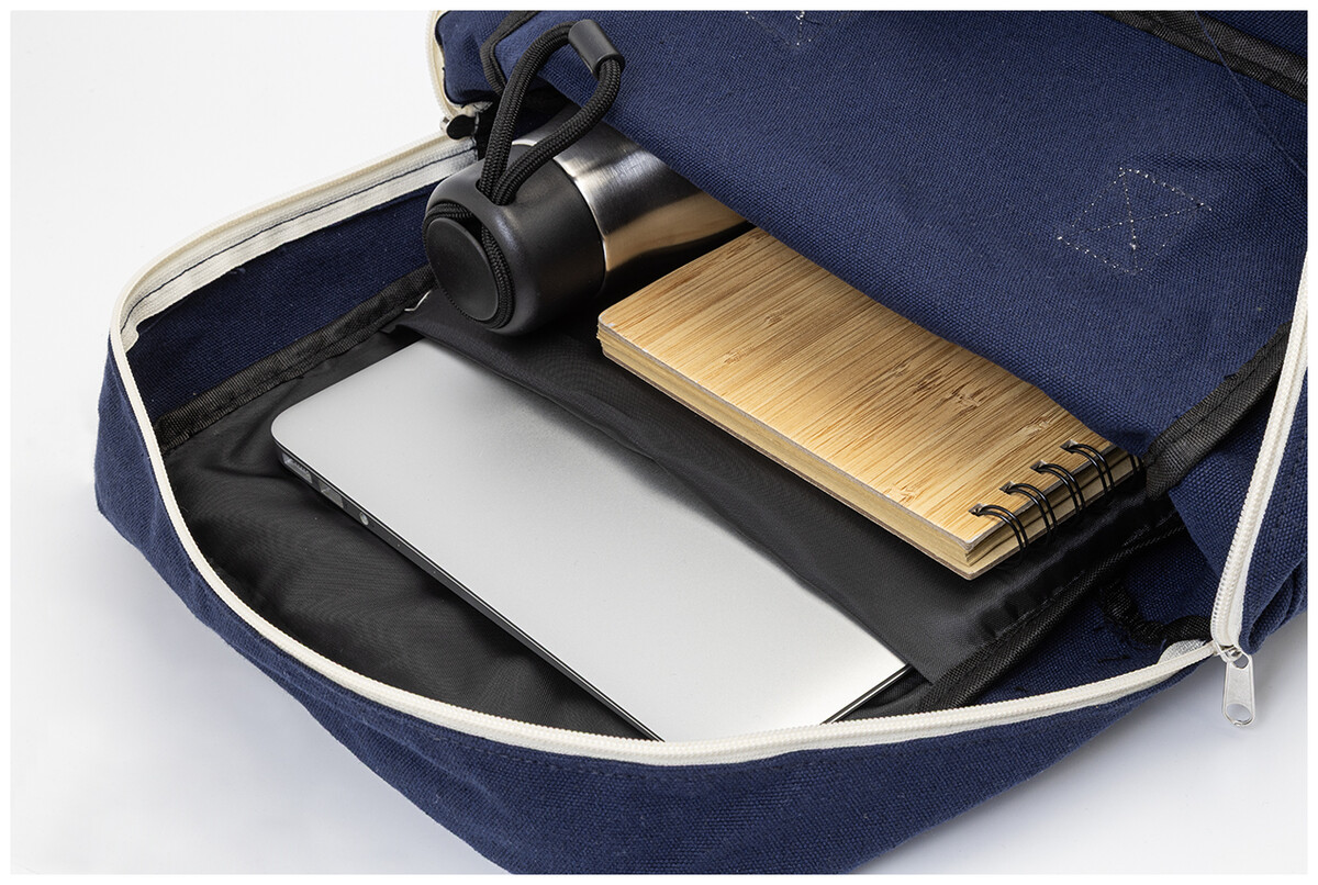 Batoh z recyklovaného plátna s hlavní přihrádkou na zip, polstrovanou přihrádkou na notebook (13") a přední kapsou na suchý zip. 70 % recyklované bavlny a 30 % RPET polyesteru. S výraznou etiketou o recyklované bavlně.