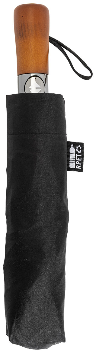 Velký, plně automatický (otevřít/zavřít) větruodolný skládací deštník s 8 panely a elegantní dřevěnou rukojetí s poutkem na ruku. S kovovým rámem a žebry ze skelných vláken. 190T RPET pongee. S charakteristickým RPET štítkem.