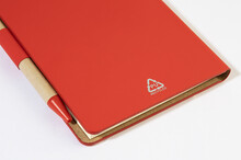 Blok s recyklovanou PU kůží, 70 linkovanými listy z recyklovaného papíru a 125 značkovači stránek (v 5 různých barvách). Včetně recyklovaného papíru a kuličkového pera z recyklovaného PP s modrou náplní.