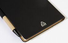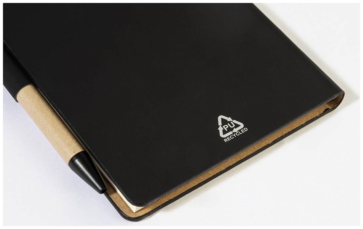 Blok s recyklovanou PU kůží, 70 linkovanými listy z recyklovaného papíru a 125 značkovači stránek (v 5 různých barvách). Včetně recyklovaného papíru a kuličkového pera z recyklovaného PP s modrou náplní.