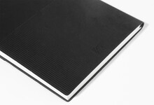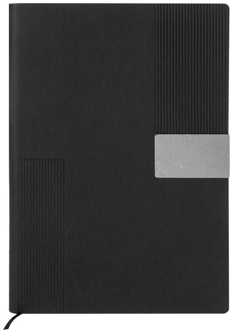 Blok A5 s recyklovanou PU kůží s pruhovanou dekorací a kovovou destičkou pro logo. Se záložkou a 80 linkovanými listy z recyklovaného papíru.