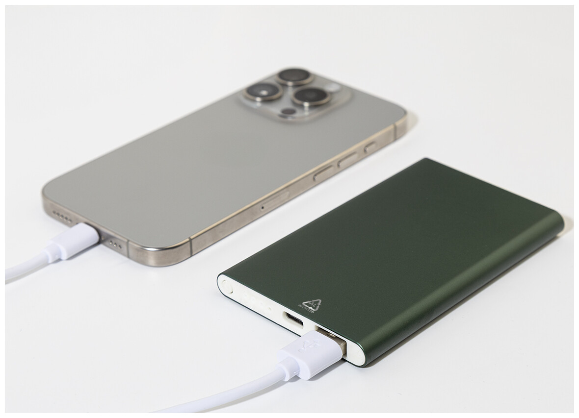 USB power banka v pouzdře z recyklovaného hliníku s 4000 mAh baterií. S 1 portem USB a 1 portem USB-C pro nabíječku. Vstupní port USB-C. Včetně USB nabíjecího kabelu.
