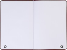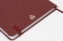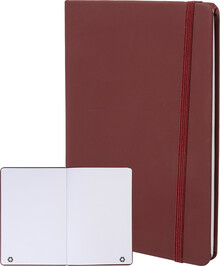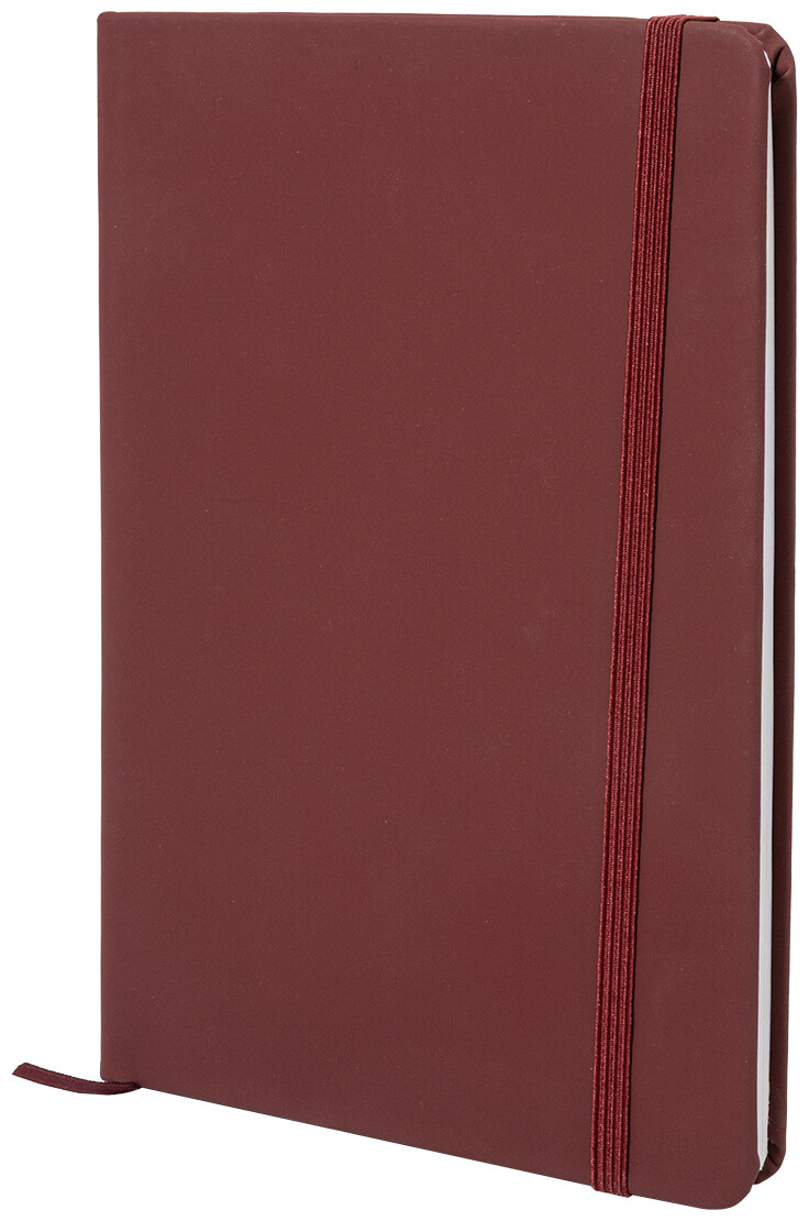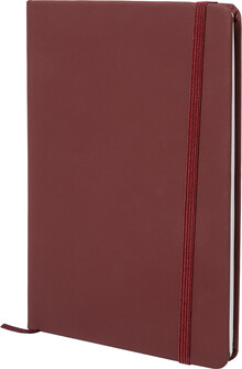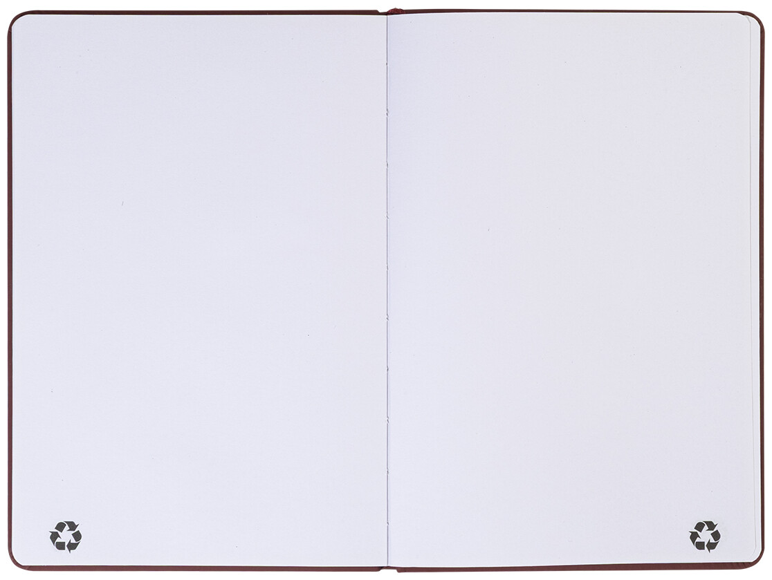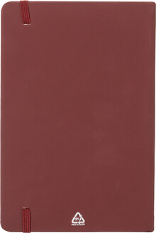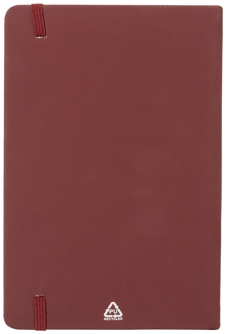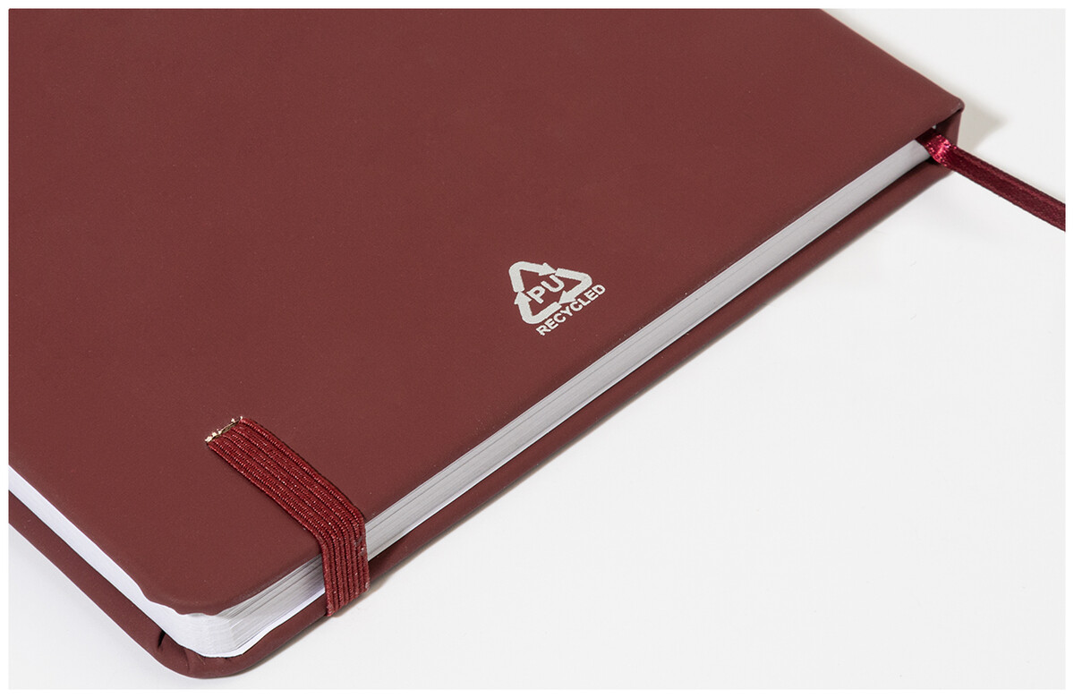 Blok A5 z recyklované PU kůže se 100 čistými listy z recyklovaného papíru. Se záložkou v odpovídající barvě a gumičkou.
