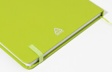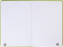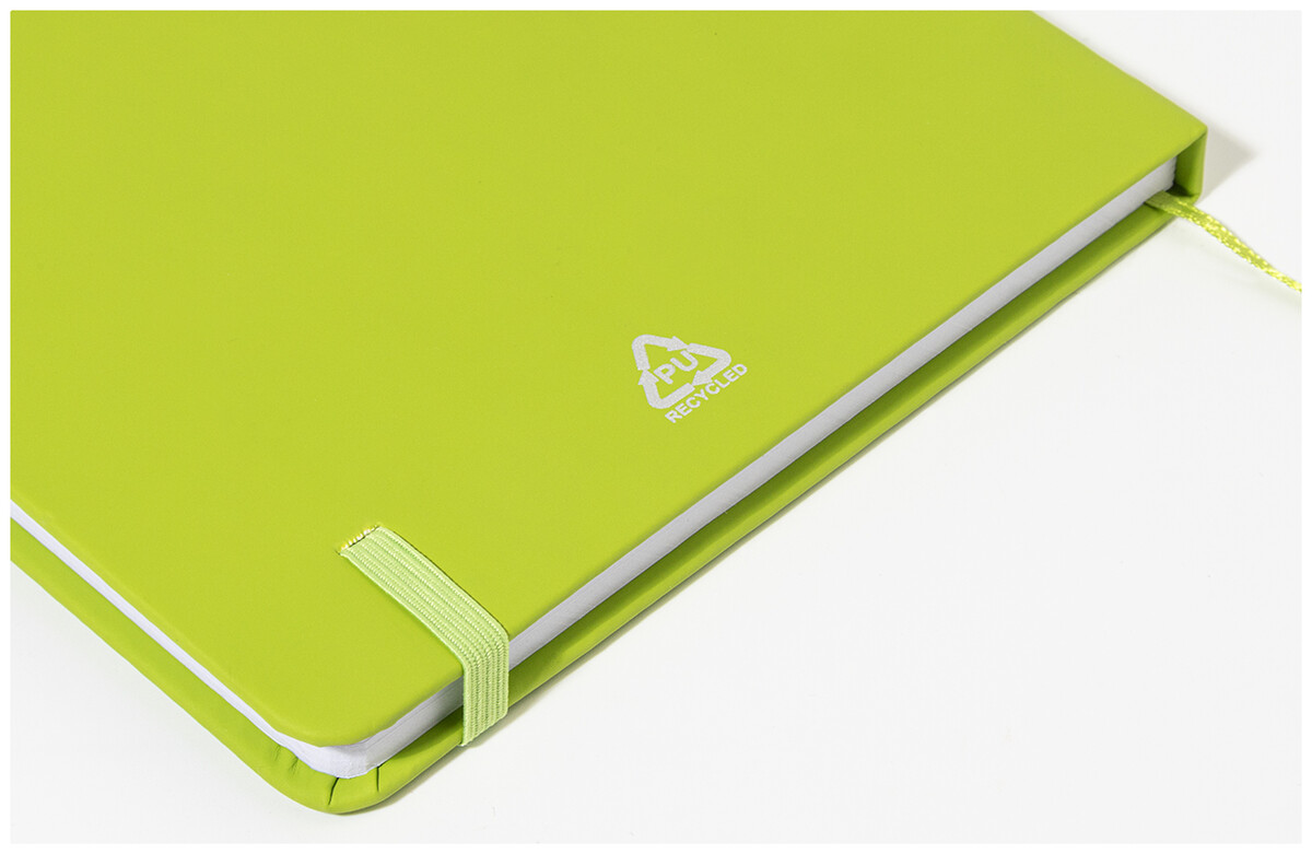 Blok A5 z recyklované PU kůže se 100 čistými listy z recyklovaného papíru. Se záložkou v odpovídající barvě a gumičkou.