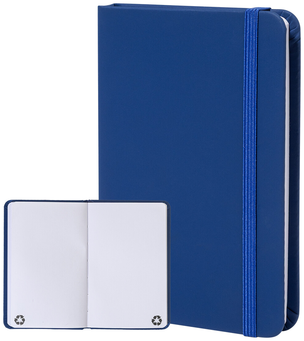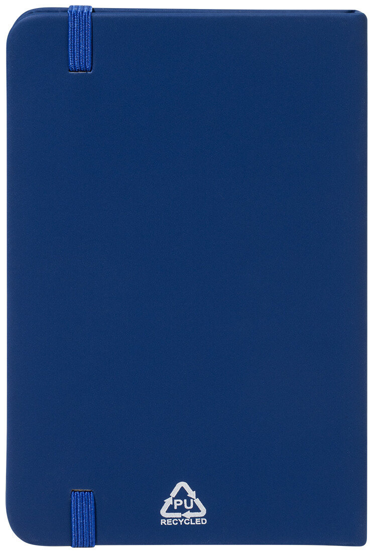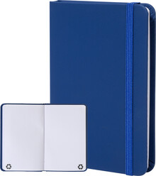 Blok A6 z recyklované PU kůže se 100 čistými listy z recyklovaného papíru. Se záložkou v odpovídající barvě a gumičkou.