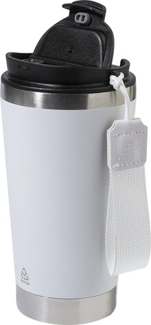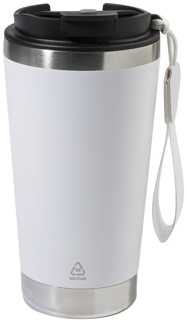 Dvoustěnný termo hrnek z recyklované nerezové oceli s víčkem na pití z PP a páskem na přenášení v odpovídající barvě. 430 ml.