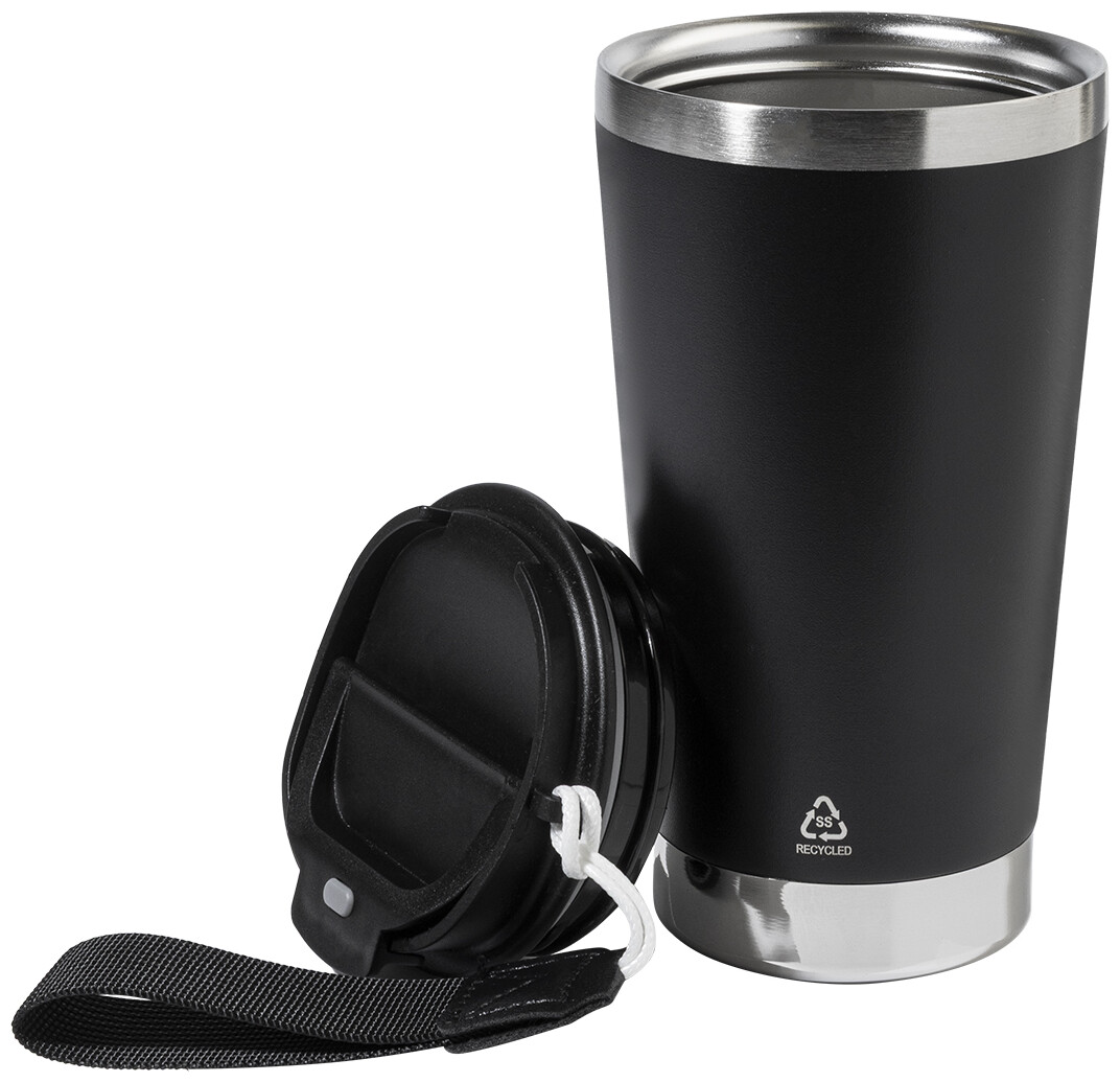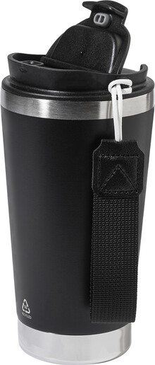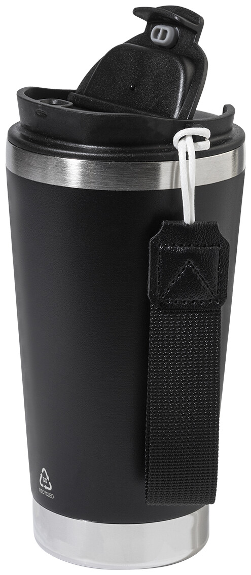 Dvoustěnný termo hrnek z recyklované nerezové oceli s víčkem na pití z PP a páskem na přenášení v odpovídající barvě. 430 ml.