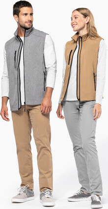 Třívrstvá, prodyšná, větru a voděodolná softshellová vesta na tělo se zipem a náprsními a bočními kapsami na zip. S prodyšnou střední vrstvou a vnitřní vrstvou z micro polar fleecu. Materiál: 95 % polyester a 5 % elastan, 300 g/m2. Výrobek značky Kariban.
