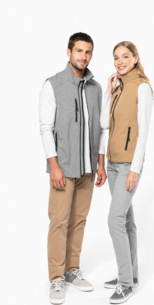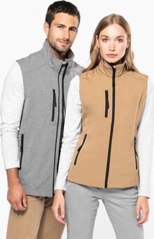 Třívrstvá, prodyšná, větru a voděodolná softshellová vesta na tělo se zipem a náprsními a bočními kapsami na zip. S prodyšnou střední vrstvou a vnitřní vrstvou z micro polar fleecu. Materiál: 95 % polyester a 5 % elastan, 300 g/m2. Výrobek značky Kariban.