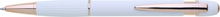 propiska z recyklovaného hliníku se soft povrchem a doplňky v růžovo-zlaté barvě. Laserované logo je lesklé, růžovo-zlaté. Náplň modře píšící. Výsledný efekt laserového značení je lesklý, v barvě doplňků.