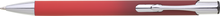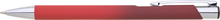 Hliníková propiska se stříbrnými doplňky a měkkým pogumovaným soft povrchem ve červeno–tmavě červeném přechodu. Náplň velkoobsahová, modře píšící.
