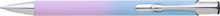 Hliníková propiska se stříbrnými doplňky a měkkým pogumovaným soft povrchem ve růžovo–světle modrém přechodu. Náplň velkoobsahová, modře píšící.