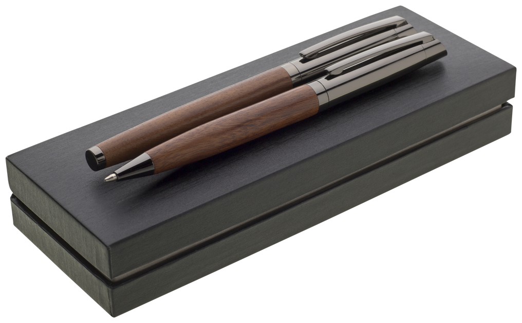 Elegantní sada s propiskou a rollerem Genero ze dřeva a kovu s metalickými doplňky v grafitové barvě, v kombinaci v dárkové krabičce. Kolekce Gabrielis.