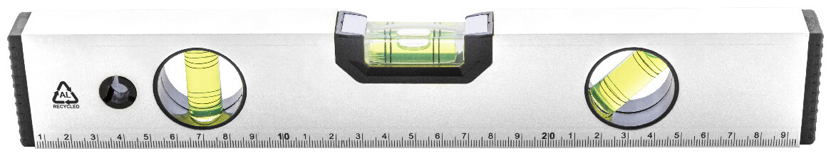 Magnetická vodováha z recyklovaného hliníku se třemi vodováhami (horizontální, vertikální a 45°) a 30cm pravítkem.