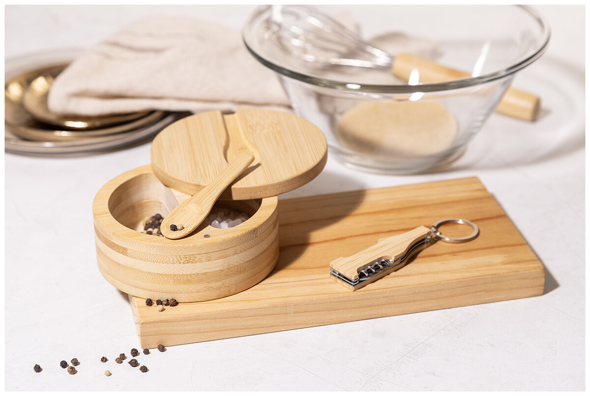 Bambusová slánka a pepřenka se dvěma přihrádkami a magnetickým otočným víkem. Včetně vestavěné servírovací lžíce.