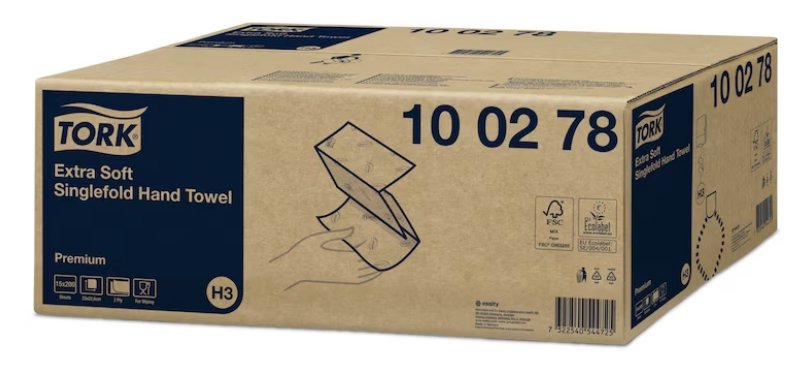 | 1740505 | Skládané papírové ručníky Tork Singlefold Premium 100278, 2vrstvé, extra jemné, bílé, systém H3 | 119,43 Kč | 144,51 Kč | 15 bal | |||