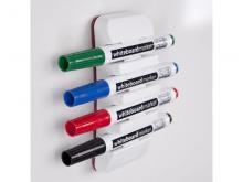Praktický magnetický držák suchých popisovačů na tabule ve vertikální poloze.