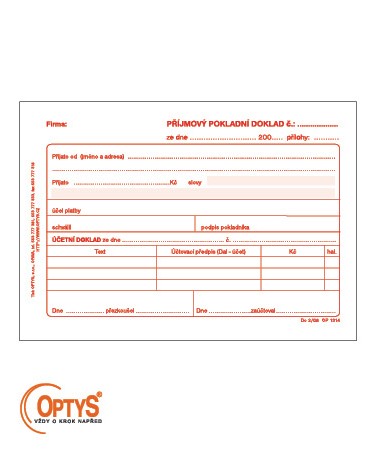 | 1709304 | PŘIJMOVÝ POKLADNÍ DOKLAD OPTYS samopropisovací 50 listů pro podvojné účetnictví | 34,03 Kč | 41,18 Kč | 1 ks | |||