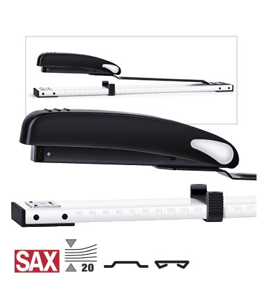 Sešívač s dlouhým ramenem. Sešívací výkon 20 listů papíru, hloubka vložení 300 mm, spony 24/6 a 26/6, Možnost pevného či volného sešití.