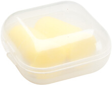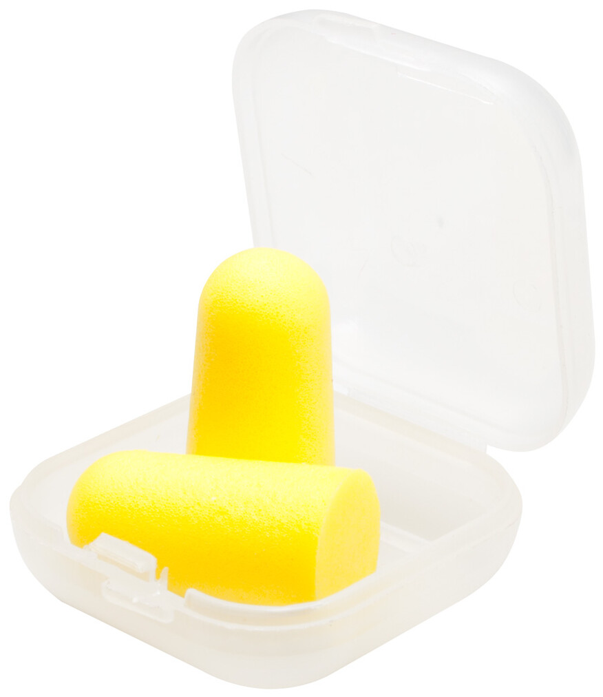 Barevné špunty do uší v průhledném, plastovém pouzdru, vyrobeno z EVA materiálu.