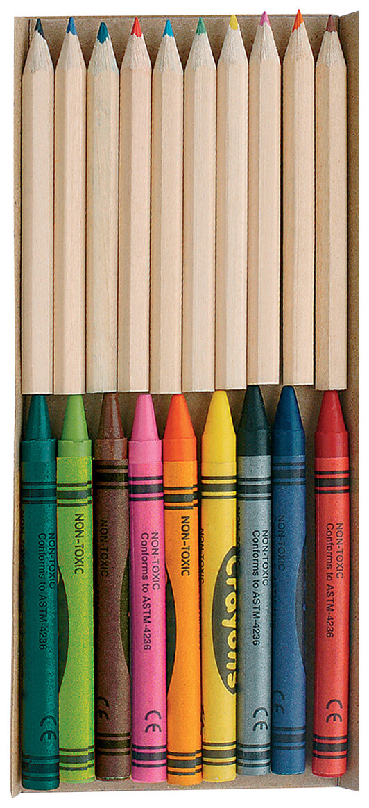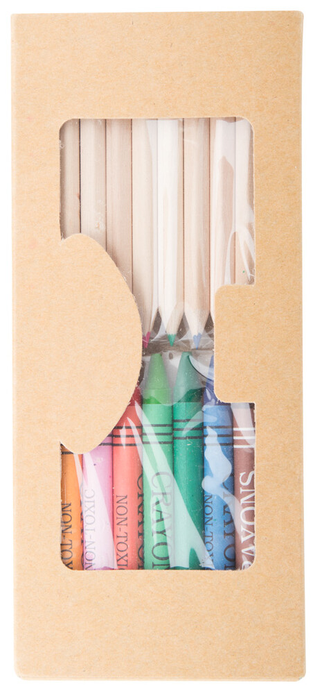 Pastelky (10 ks) a voskovky (9 ks) v krabičce s okénkem z recyklovaného kartonu.
