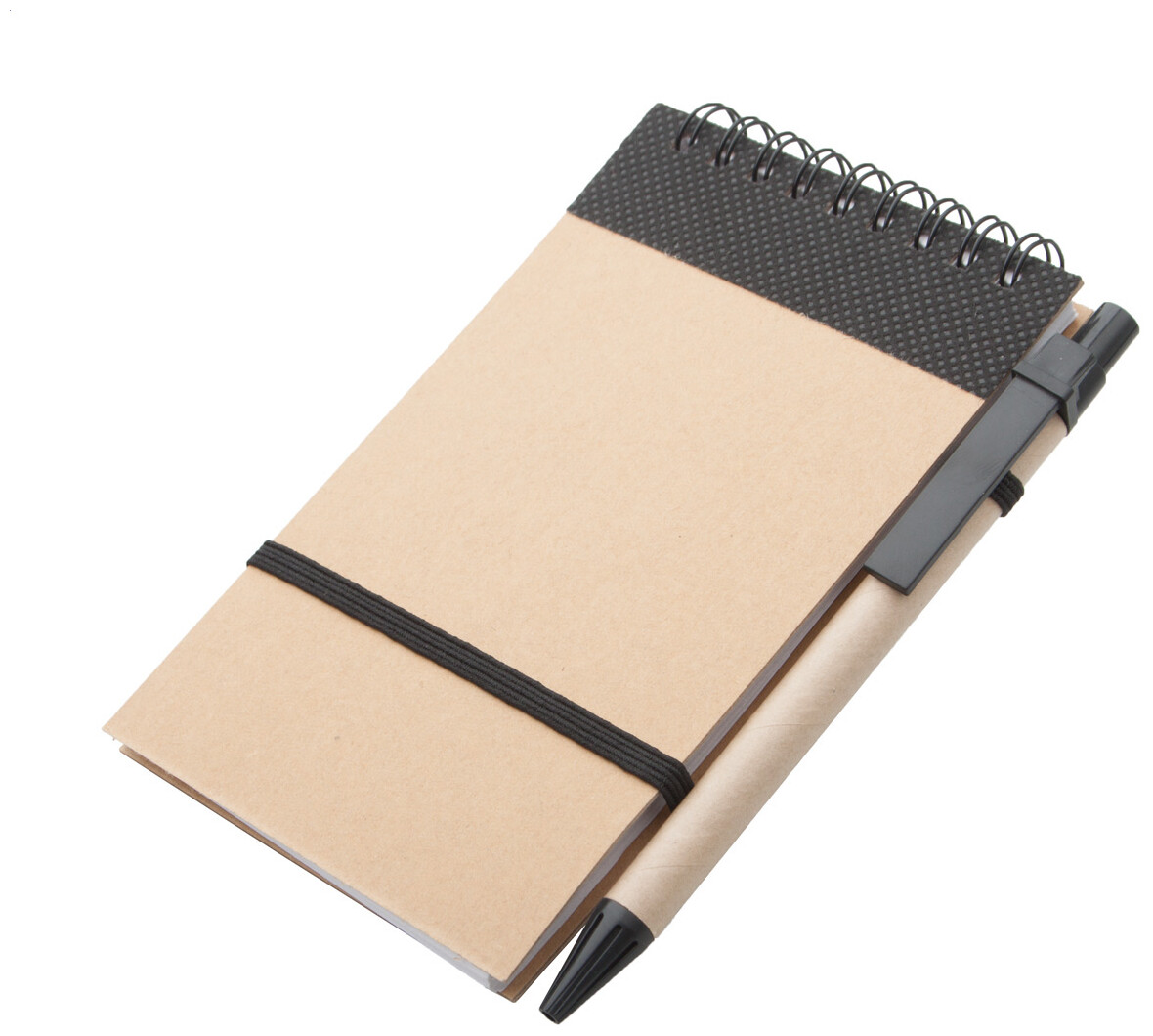 Blok ve spirále z recyklovaného papíru se 70 linkovanými listy a kuličkovým perem z recyklovaného papíru s modrou náplní. Velikost A6.