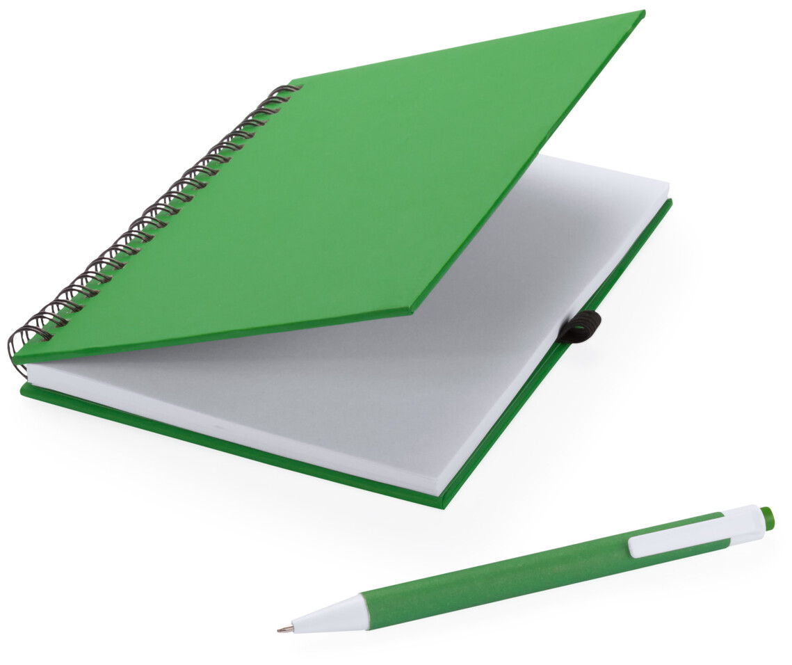 Poznámkový blok se 70 čistými listy a spirálovou vazbou v kartonových deskách, vč. stejně barevného kuličkového pera z recyklovaného papíru s modrou náplní.